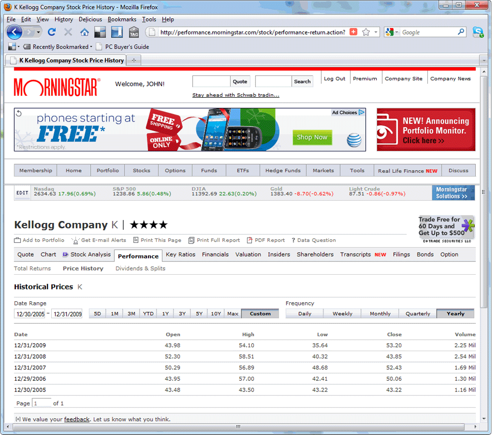 Using a free site such as Morningstar.com, you can find the high and low prices of a company on an annual basis. Figure 2 shows the annual price history for Kellogg Company (K) from the start of 2005 through the end of 2009. Interestingly enough, however, we found a data error at the Morningstar site. While the site claimed that the high price for K